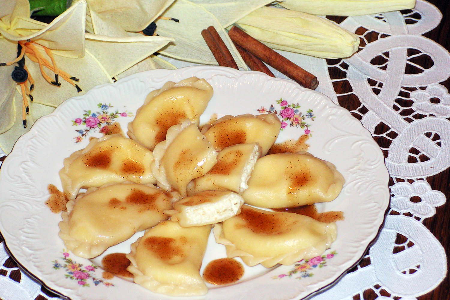 Sposób wykonania: Mąkę wymieszać z ciepłą wodą, dodać olej i jajko. Wyrabiać ciasto do uzyskania plastycznej masy. Zakryć bawełnianą ściereczką i odstawić do lodówki. Twaróg wymieszać z żółtkiem, łyżeczką cukru waniliowego i 2 łyżkami śmietany. Doprawić cukrem do smaku. Jeśli masa twarogowa jest za rzadka, wsypać do niej trochę bułki tartej. Ciasto rozwałkować. Szklanką wykroić krążki. Na każdy z nich kłaść nadzienie serowe i sklejać. Pierogi wrzucać na lekko posolony wrzątek (dodać do wody odrobinę oleju). Gotować do wypłynięcia. Pierogi podawać lekko schłodzone lub zimne. Polać posłodzoną śmietaną z dodatkiem cynamonu lub sosem miodowo-cynamonowym.