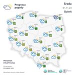 Zachmurzenie umiarkowane, a w centrum przejściowo małe. Więcej chmur głównie na północy i południu kraju, gdzie mogą pojawiać się słabe opady deszczu. Na termometrach od 8°C na północy, 13°C w centrum, do 15°C na południu kraju. Wiatr będzie już słabszy, tylko nad morzem oraz na wschodzie kraju początkowo porywisty, z zachodu i południowego zachodu.