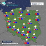W sobotę (23 grudnia) zachmurzenie duże. Miejscami opady śniegu, tylko w dzień deszczu ze śniegiem, a na zachodzie też deszczu. Temperatura minimalna od -3°C na Podhalu i -1°C na północnym wschodzie do 2°C, 3°C na zachodzie. Temperatura maksymalna na wschodzie oraz w centrum od 0°C do 3°C, na pozostałym obszarze od 5°C do 8°C. Wiatr umiarkowany i dość silny, w porywach do 85 km/h, zachodni i południowo-zachodni.