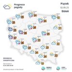 W piątek (2 maja) w kraju zachmurzenie umiarkowane, okresami duże. Miejscami, za wyjątkiem Górnego Śląska, Małopolski, Podkarpacia i Lubelszczyzny, przelotny deszcz oraz burze. W czasie burz prognozowana suma opadów miejscami do około 15 mm – 20 mm, lokalnie do 25 mm oraz opady gradu. Temperatura maksymalna od 17 st. C nad morzem i 19 st. C miejscami na północy, około 23 st. C w centrum do 26 st. C, 27 st. C na zachodzie. Wiatr będzie słaby i umiarkowany, na północy okresami dość silny, okresami porywisty, w czasie burz w porywach do 80 km/h, miejscami na północy, zachodzie i w centrum do 90 km/h, południowo-zachodni i zachodni.