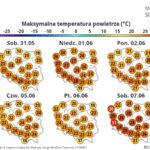 Najbliższe dni będą stosunkowo ciepłe, ale jednocześnie deszczowe oraz burzowe. Najcieplej będzie najprawdopodobniej w niedzielę i środę, gdy temperatura maksymalna może wzrosnąć na południowym zachodzie i w centrum kraju do 26°C, 28°C. W tych dniach także burze mogą być najbardziej gwałtowne, z intensywnymi opadami deszczu, z gradem oraz silnymi porywami wiatru do 70-80 km/h.