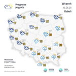 We wtorek (10 czerwca) zachmurzenie małe i umiarkowane, okresami wzrastające do dużego. Miejscami, głównie na północy, okresami opady deszczu. Temperatura minimalna od 7°C do 12°C, chłodniej miejscami na terenach podgórskich, około 5°C. Temperatura maksymalna od 15-16°C miejscami na północy, około 19°C w centrum, do 22°C na południu. Wiatr słaby, okresami umiarkowany i porywisty, nad morzem w porywach do 60 km/h, południowo-zachodni i zachodni.