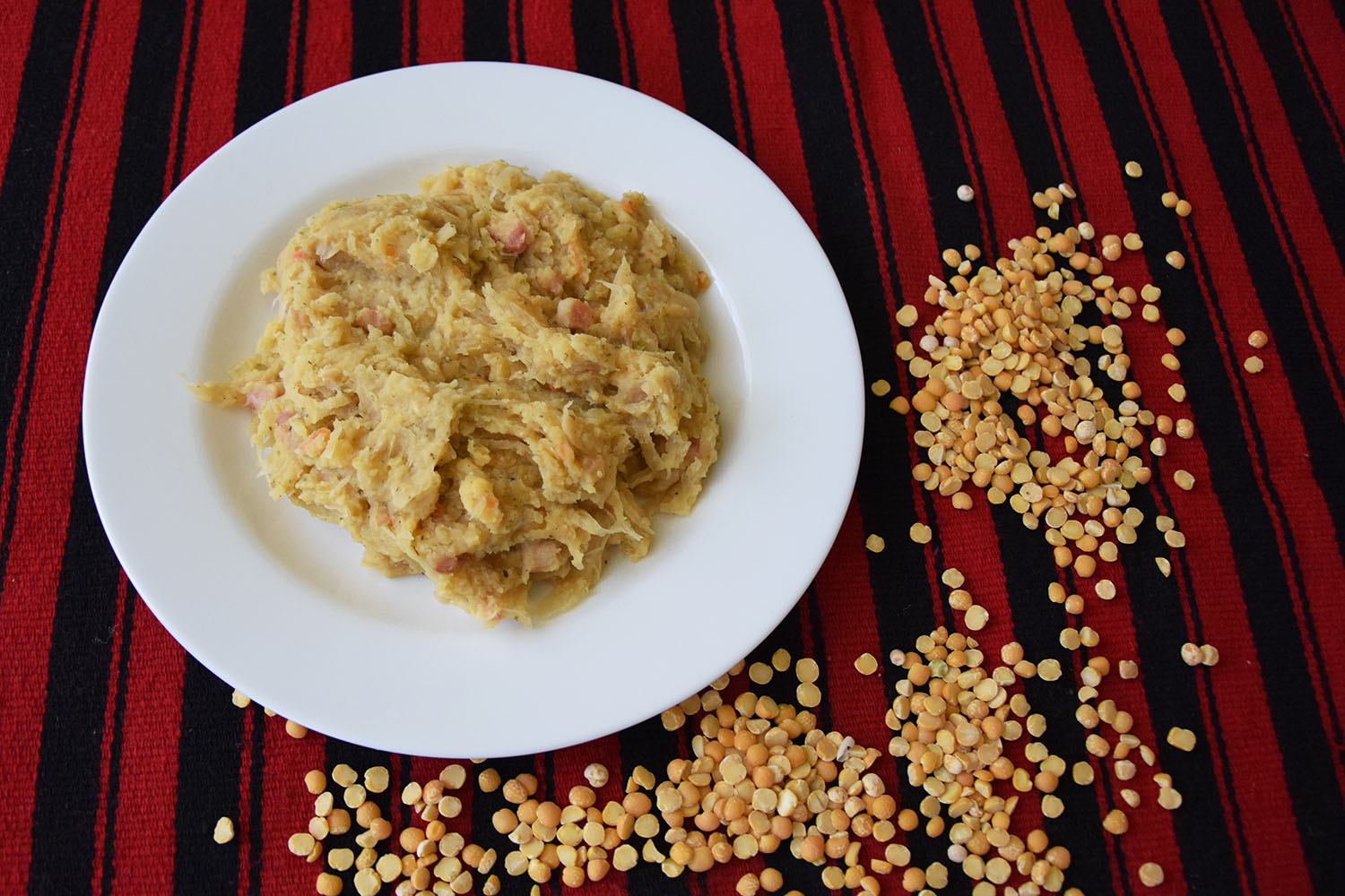 Składniki: 1 kg kapusty, ½ kg grochu łupanego (zalanego wodą), ½ kg ziemniaków, 2 duże cebule, pieprz, sól, liść laurowy, ziele angielskie, 2 marchewki, 1 pietruszka, 15 dag słoniny, 15 dag boczku.