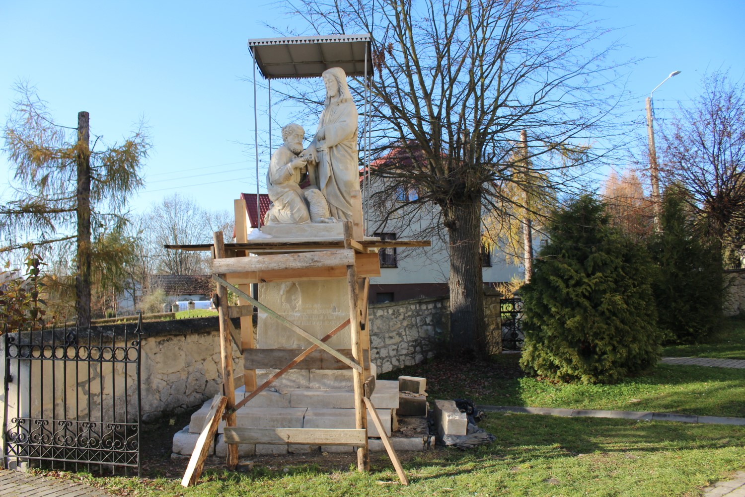 Przed kościołem pod wezwaniem świętych Apostołów Piotra i Pawła w Sancygniowie trwają prace konserwatorskie przy zabytkowej figurze przedstawiającej Chrystusa przekazującego klucze świętemu Piotrowi.