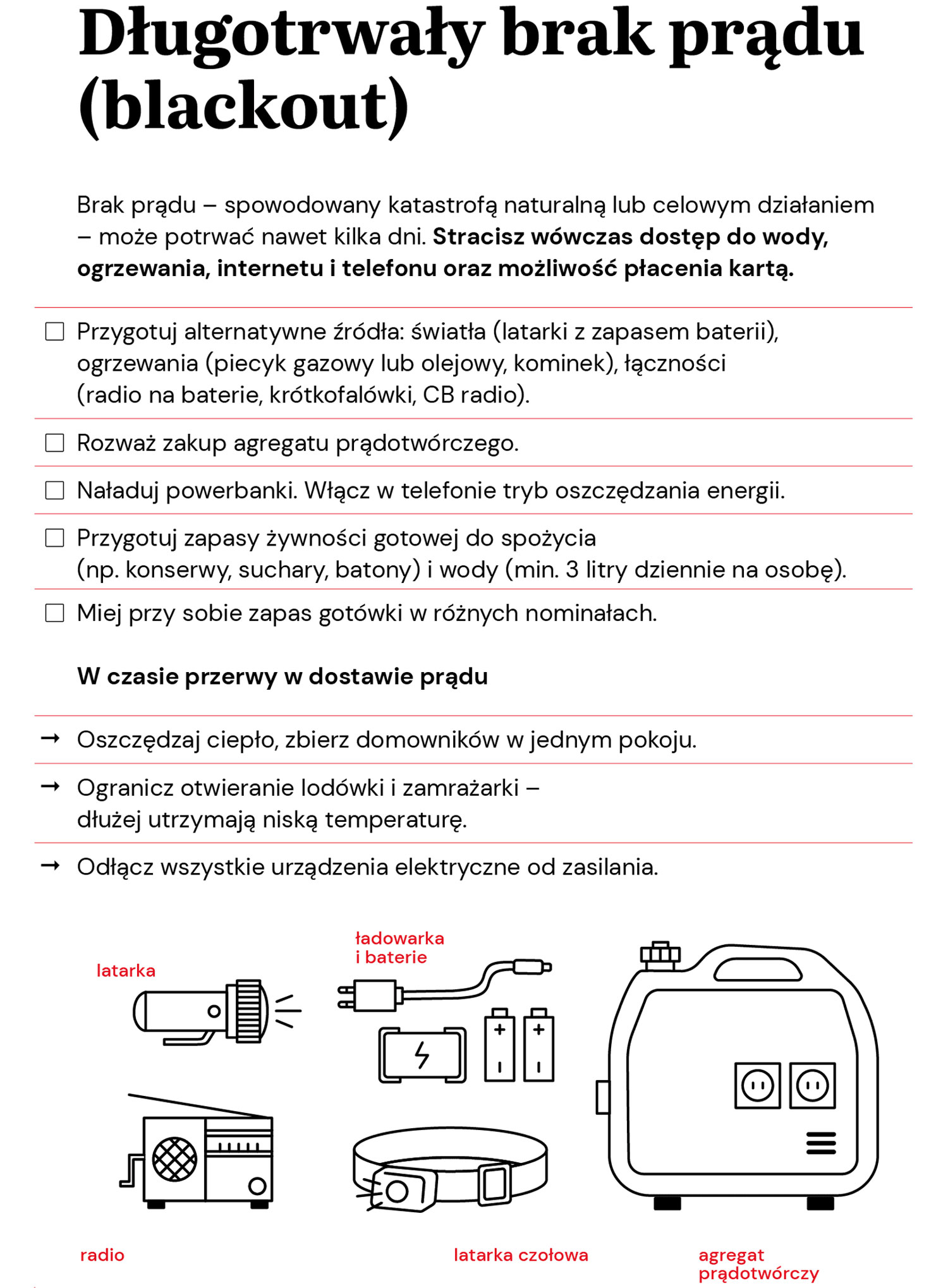 I radzi, aby w domu posiadać zapasy, urządzenia, które mogą okazać się niezbędne w przypadku długotrwałego braku prądu. Przede wszystkim alternatywne źródła światła, ogrzewania, łączności i zasilania, a także zapasy żywności i wody.
