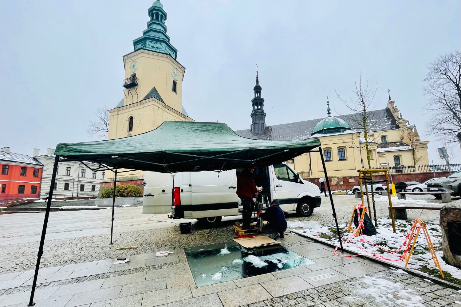 Jak tłumaczy Olga Grabiwoda, dyrektor Biura Wystaw Artystycznych w Kielcach, z którego inicjatywy została zrealizowana rzeźba przed kielecką katedrą, ponieważ w niedzielę spadł śnieg, konieczne było wykonanie tymczasowego zabezpieczenia. Teraz jest realizowane to, które było zaplanowane.