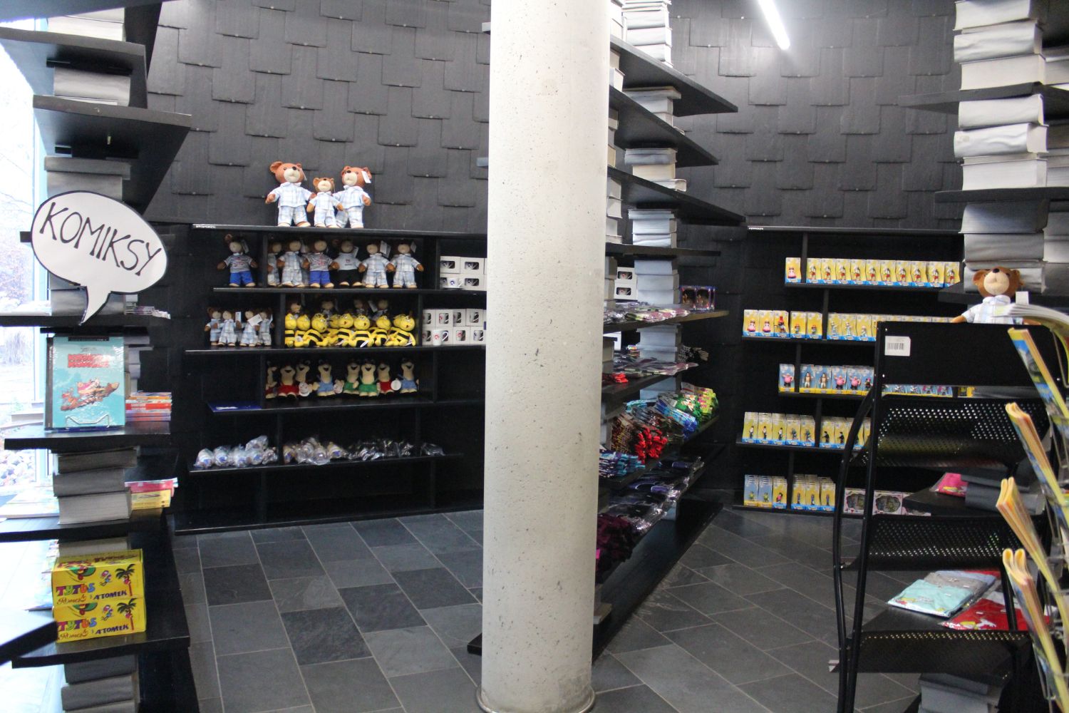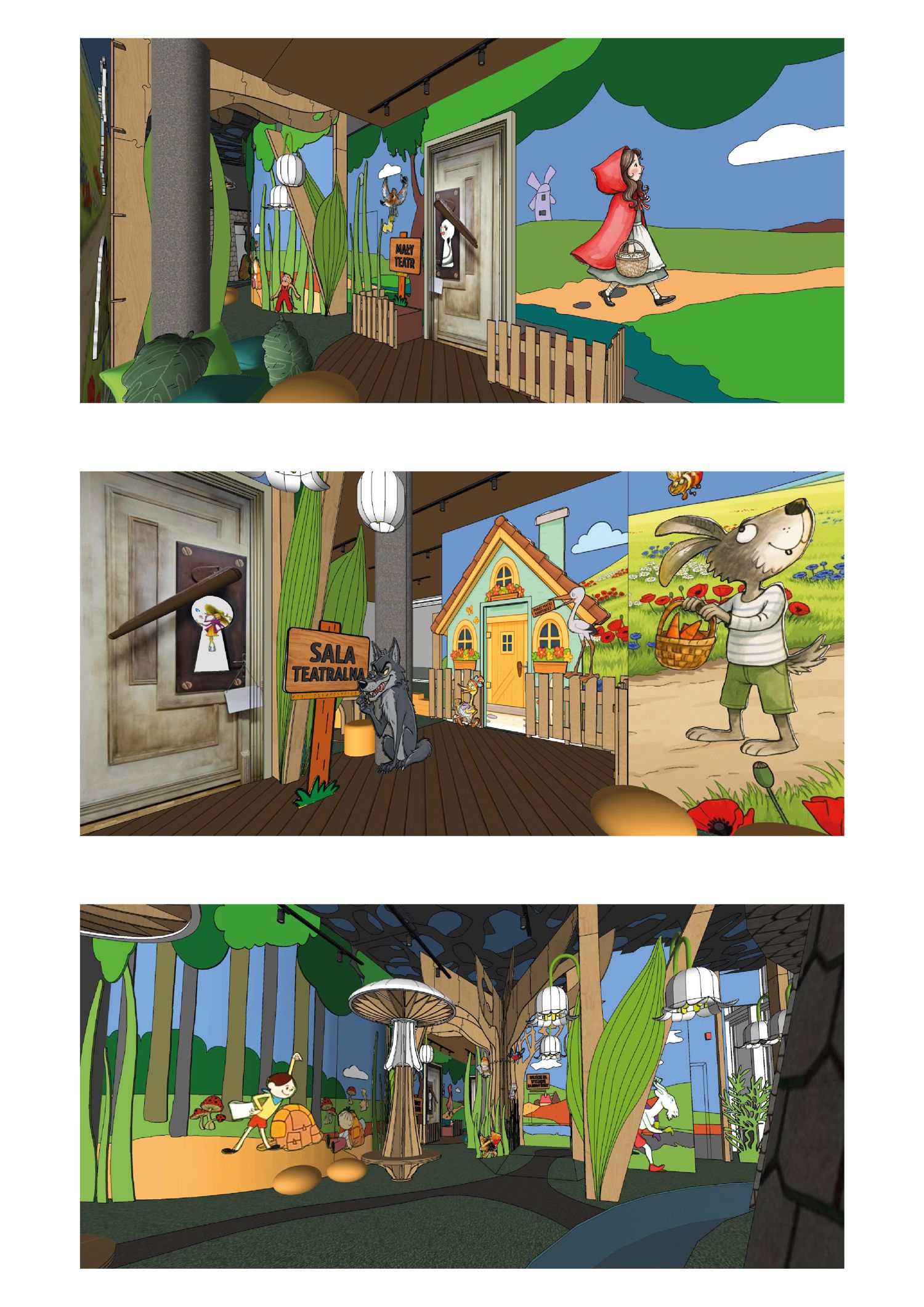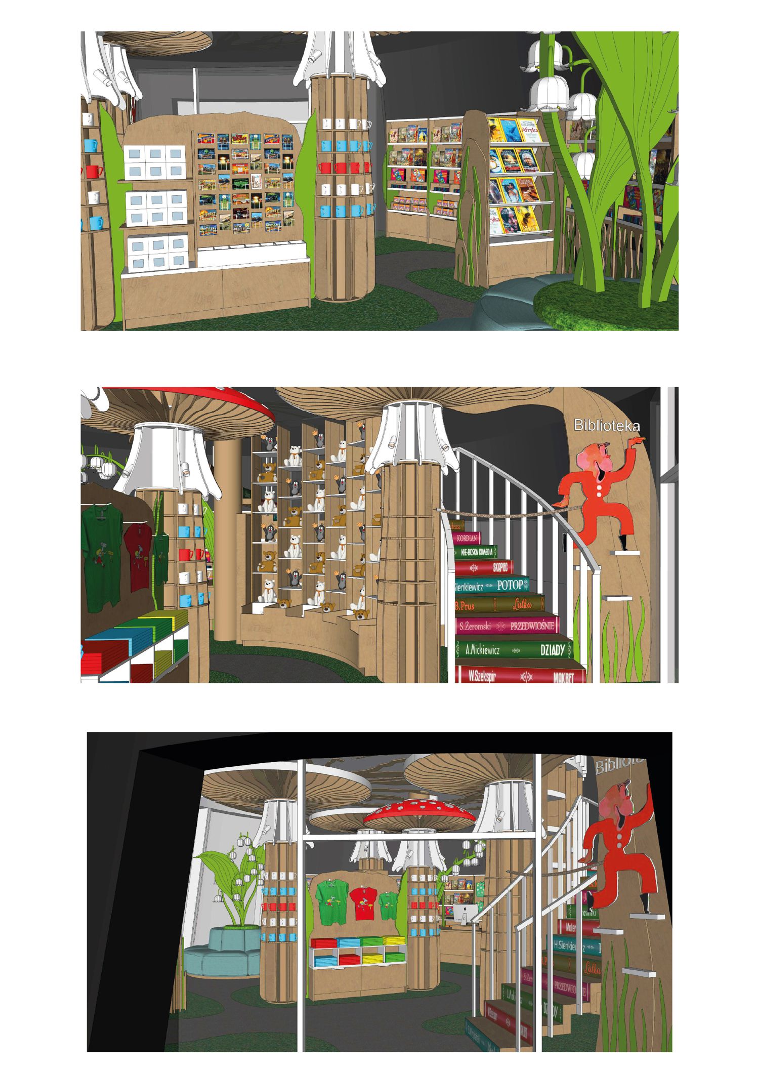– Pojawią się gigantyczne, przeskalowane rośliny – konwalie i muchomory, pełniące funkcję siedzisk, oświetlenia, a w księgarni nawet… półek na książki. Przestrzeń wzbogacą kultowe postacie bajkowe: Czerwony Kapturek, Kot Filemon, Bolek i Lolek czy Krecik – dodaje.