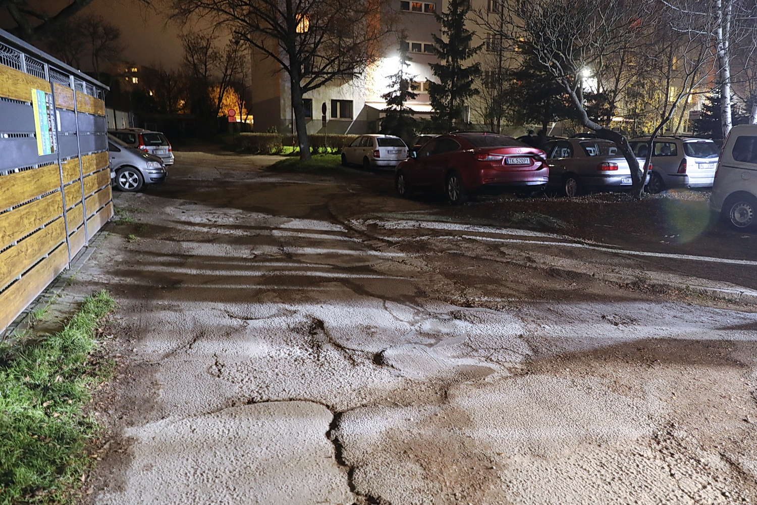 Przy bloku nr 31 są dziury w chodniku, wyrwy w jezdni, brak też oświetlenia. W audycji Interwencja pytaliśmy o to, kiedy będzie tu bezpiecznie, a ludzie nie będą łamali sobie kończyn.