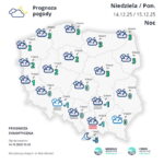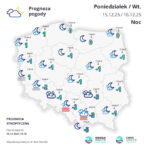 W poniedziałek (15 grudnia) na południu i zachodzie pogodnie, miejscami bezchmurnie. Jednak pojawią się tam zanikające mgły ograniczające widzialność do 200 m. Na północnym obszarze Polski zachmurzenie duże z postępującymi od południowego zachodu większymi przejaśnieniami. Temperatura przyjmie wartości od 3 st. C na południu i na wschodzie, około 5 st. C na przeważającym obszarze kraju, do 7 st. C na zachodzie i nad samym morzem. Wiatr słaby, miejscami umiarkowany, na północnym wschodzie i południu porywisty, a w Bieszczadach z porywami do 55 km/h.