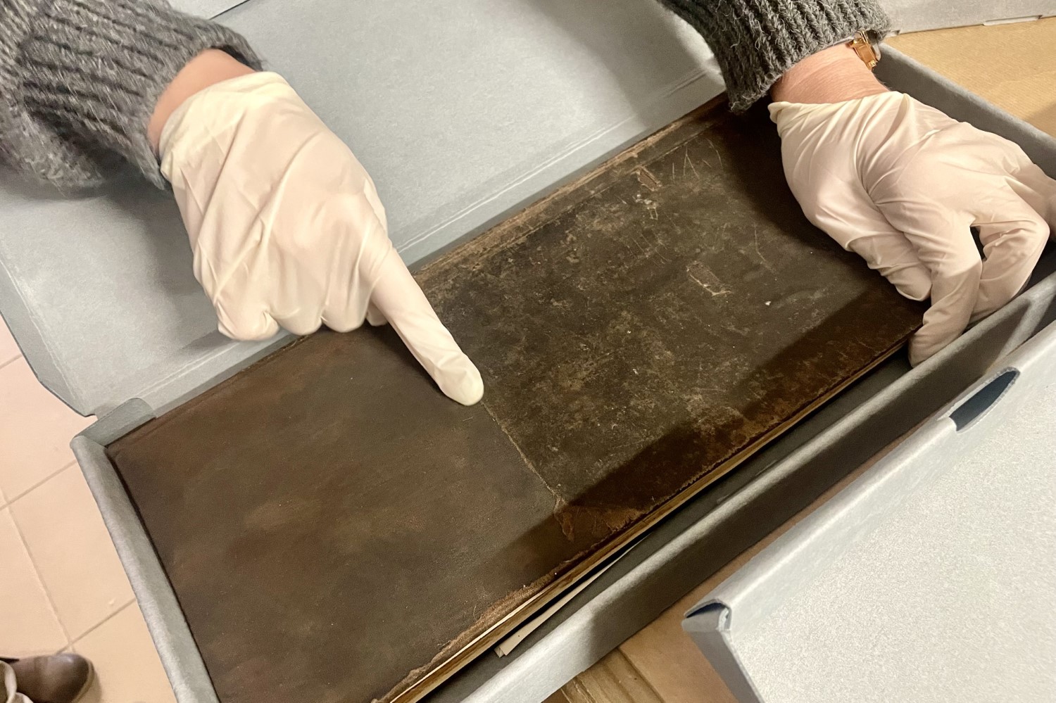 Książki odzyskały świetność, ale prace zostały tak wykonane, że widać ingerencję konserwatora. Dr Wioletta Brzezińska-Marjanowska wskazuje na przykład płóciennej okładki inwentarza.