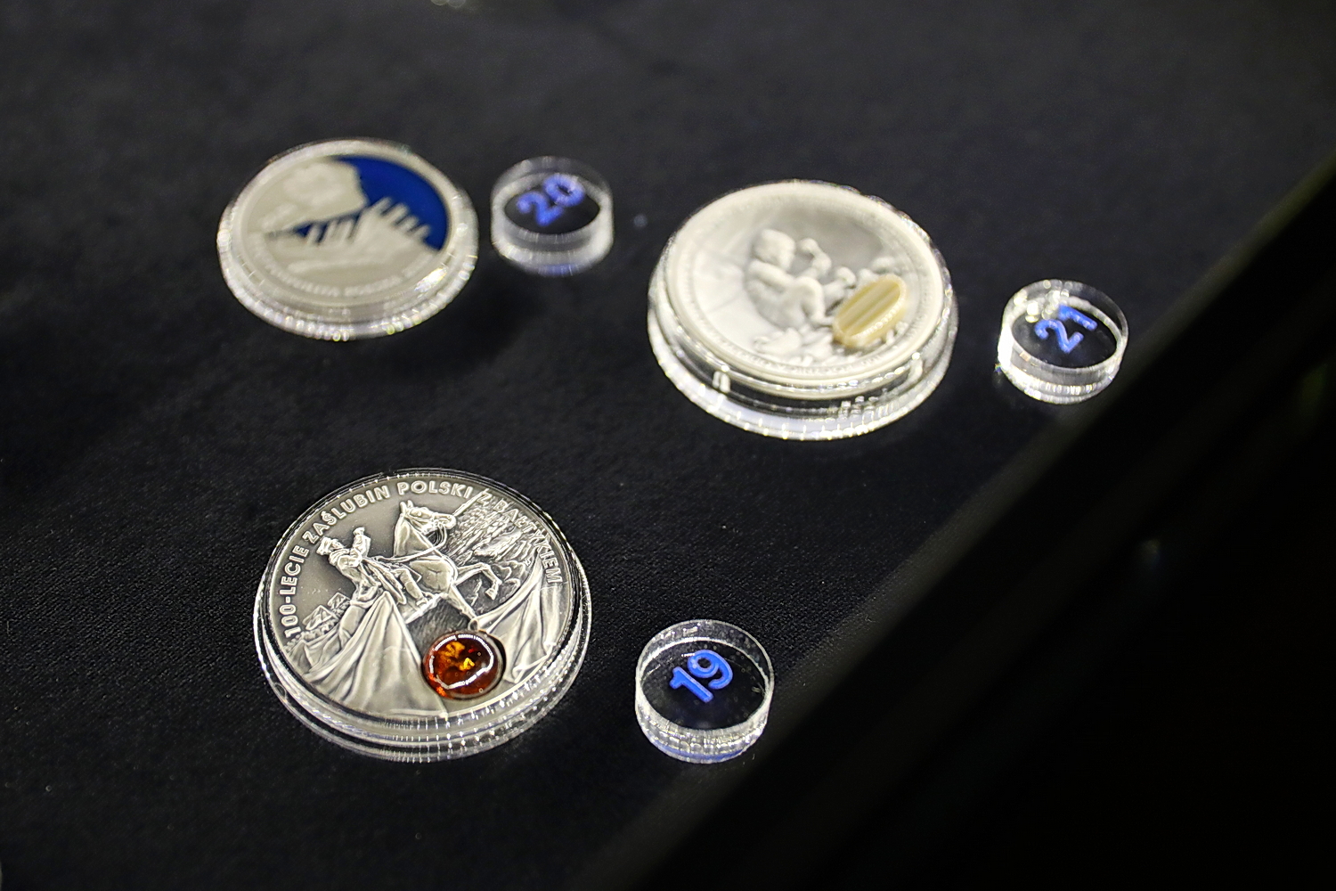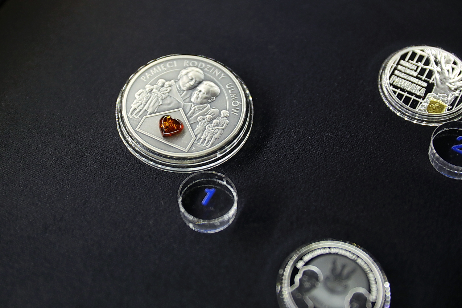 – Natomiast mamy dwie monety zdobione bursztynem. Jedna upamiętnia stulecie zaślubin Polski z Bałtykiem, a druga rodzinę Ulmów – dodaje historyk.
