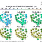 W środę i czwartek (25 i 26 lutego) dużo pogodnego nieba, choć lokalnie, zwłaszcza w środę, mogą pojawić się słabe przelotne opady deszczu. Ciepło, szczególnie na południowym zachodzie. Temperatura maksymalna od 2°C na Suwalszczyźnie w sobotę i 7°C w niedzielę, około 12°C w centrum, do 15°C na południowym zachodzie. W nocy temperatury od –4°C do 2°C. Wiatr słaby i umiarkowany, w górach porywisty, południowy.