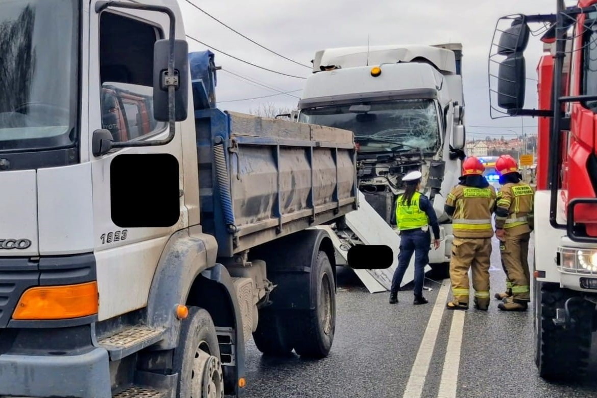 Utrudnienia na ulicy Lwowskiej (fragment DK 77) w okolicach skrzyżowania z ulicą Stoczniową w Sandomierzu. W zdarzeniu drogowym, do którego doszło we wtorek (24 lutego) po godzinie 14.00 brały udział dwa pojazdy ciężarowe.