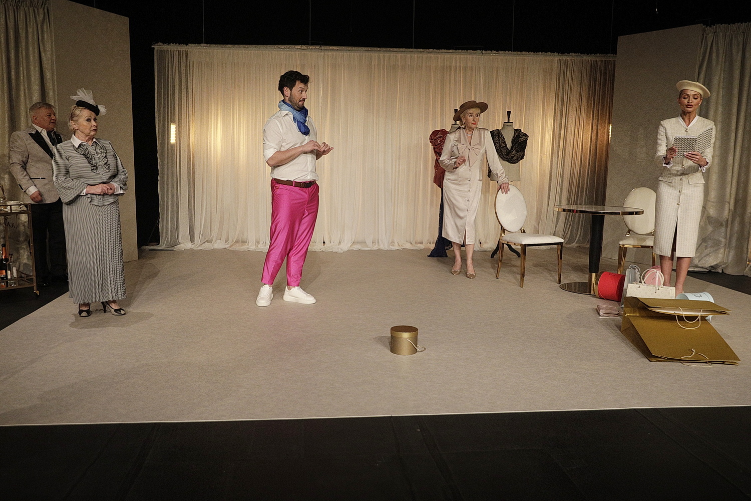 Akcja komedii rozgrywa się w paryskim domu mody, stąd scenografia i kostiumy grają w przedstawieniu jedną z najważniejszych ról. Na potrzeby kameralnej małej sceny Kieleckiego Centrum Kultury przygotował ją Adrian Lewandowski, który jednocześnie jest scenografem i projektantem mody. W Kielcach dwa lata temu projektował scenografię w Teatrze Lalki i Aktora „Kubuś” do sztuki „Wio Leokadio”, a wcześniej był laureatem konkursu „Off Fashion”.