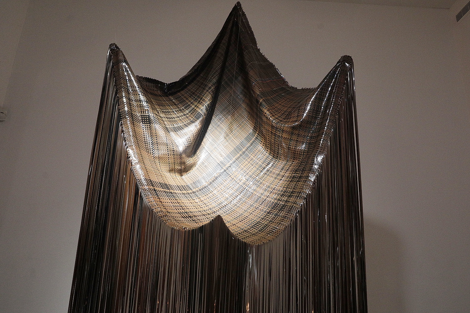 – To jest pewnego rodzaju sięgnięcie do mojego domowego archiwum, do kaset magnetofonowych. Kasety są nie tylko moje, ale też takie, które należały do mojej rodziny czy przyjaciół. Zaprojektowałem tkaninę, którą uplotłem ręcznie z taśm z tych kaset. W ten sposób chciałem połączyć nasze historie, sięgnąć po to, co zostało zakodowane. Celowo jednak nie dostarczam na tej wystawie narzędzia, które pozwalałoby odczytać te treści, Najważniejsze jest spotkanie w tej pracy tych naszych historii. Wykorzystałem materiał, który tak naprawdę jest już niepotrzebny, do tego, by za pomocą upcyklingu wykreować nowy produkt. To jest takie badanie tego, co można jeszcze z tym zrobić – podkreśla.
