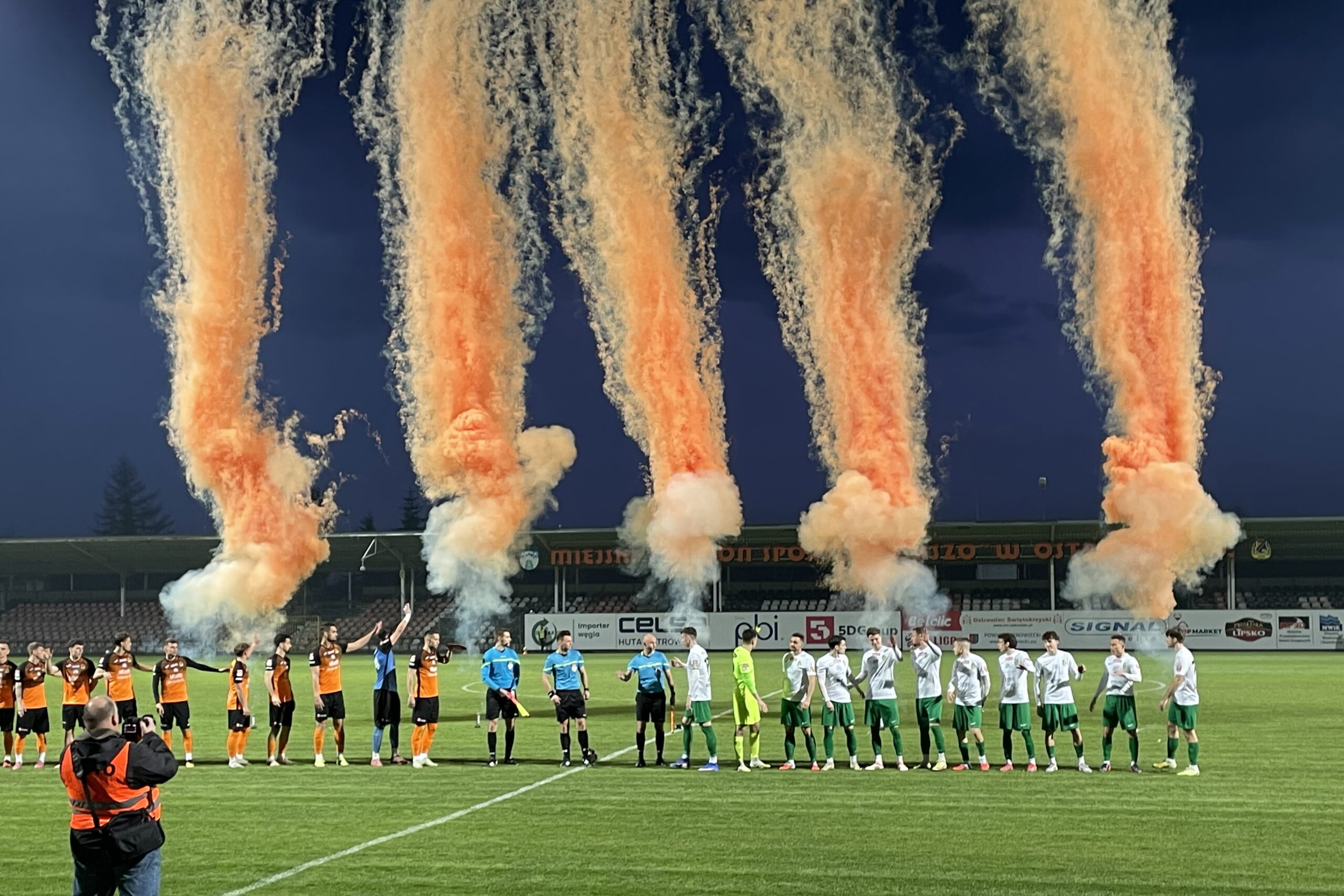 Goście objęli prowadzenie w 64. po golu Jana Mroza. W 51. Ostrowczanie zmuszeni byli grać w „dziesiątkę”, po drugiej żółtej, w konsekwencji czerwonej kartce dla Piotra Łazarza. Pomarańczowo-Czarni mimo gry w osłabieniu zdołali strzelić dwie bramki. Do wyrównania doprowadził w 67. Jarosław Lis, a zwycięskiego gola zdobył w 84. Mateusz Majewski.