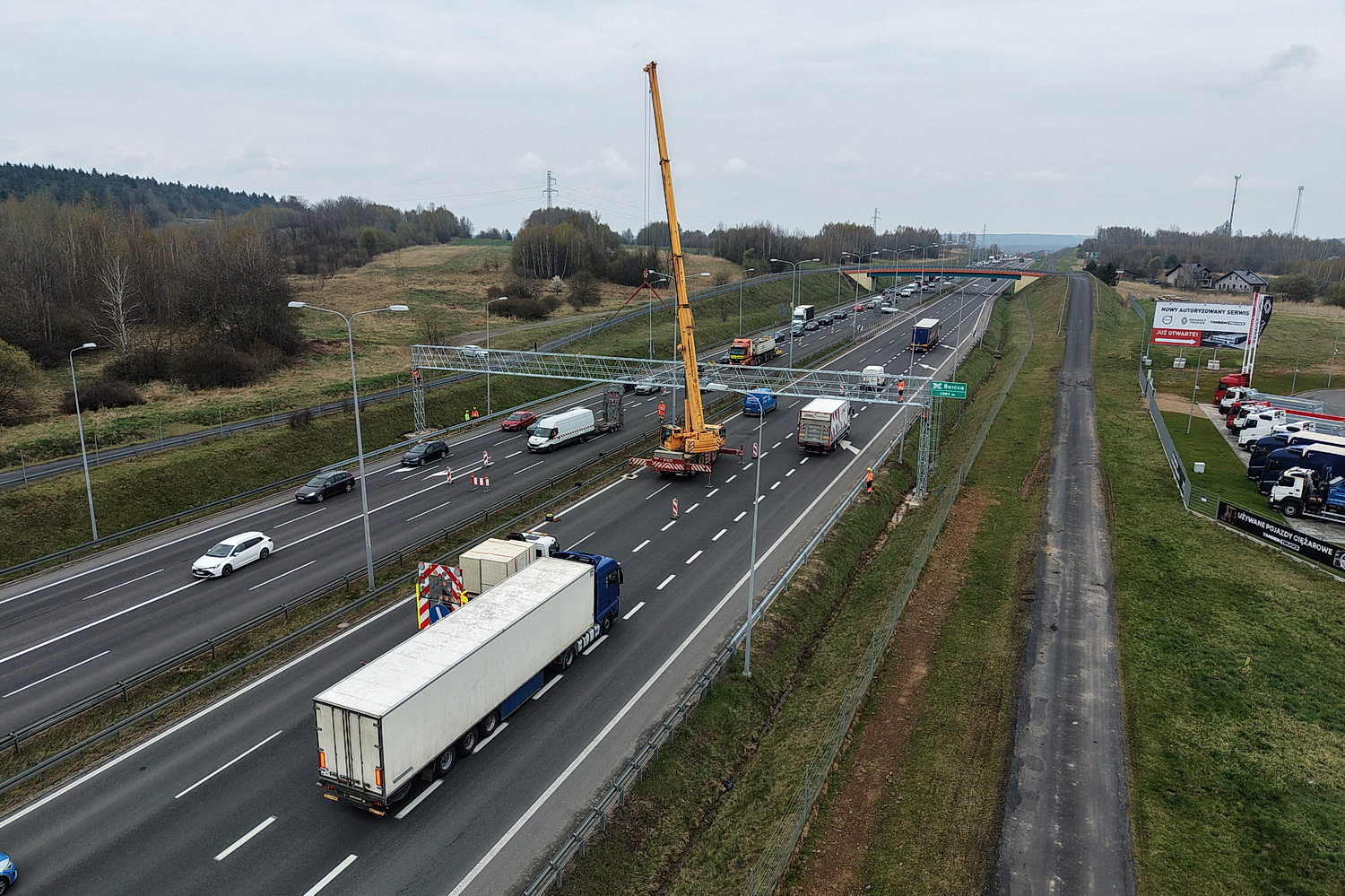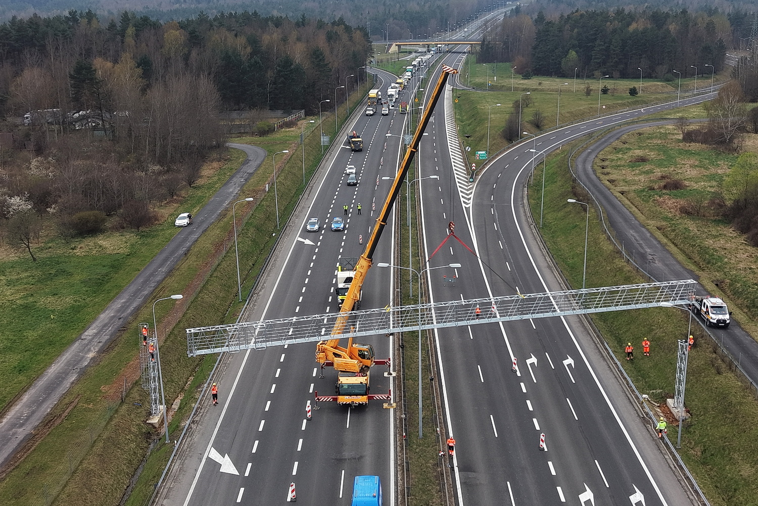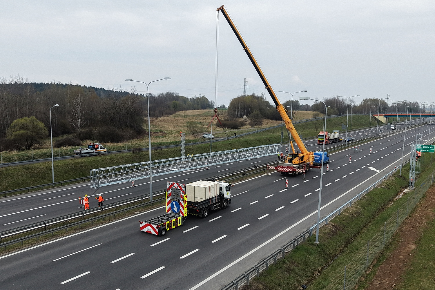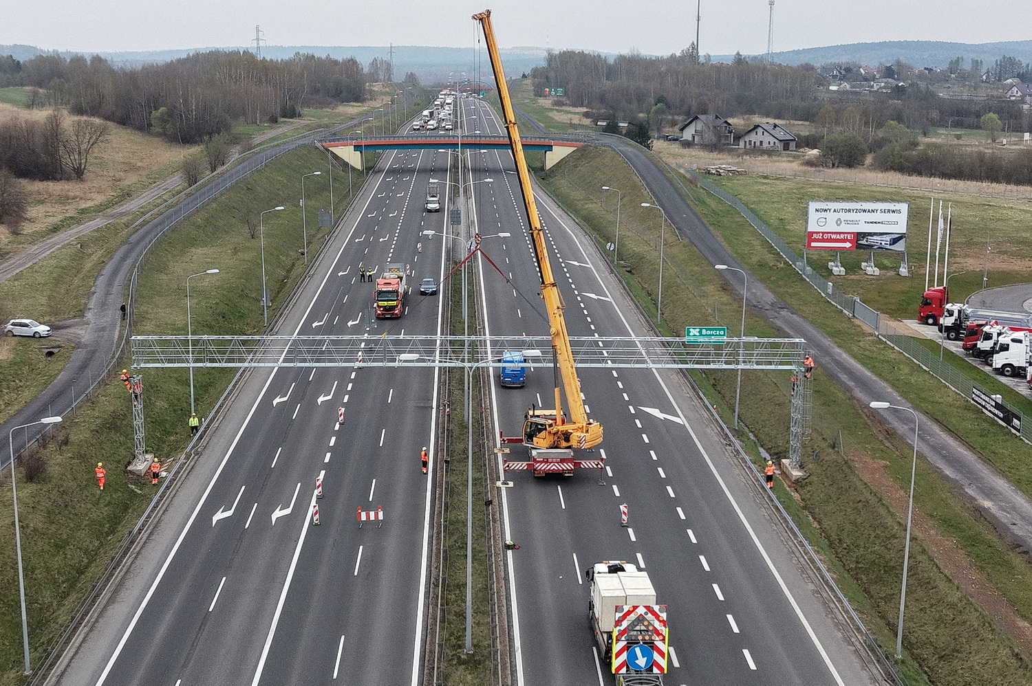 15.04.2026. Trasa ekspresowa S7, okolice węzła Kielce Północ. Montaż tzw. bramownic niezbędnych do uruchomienia odcinkowego pomiaru prędkości (OPP) / Fot. Jarosław Kubalski – Radio Kielce