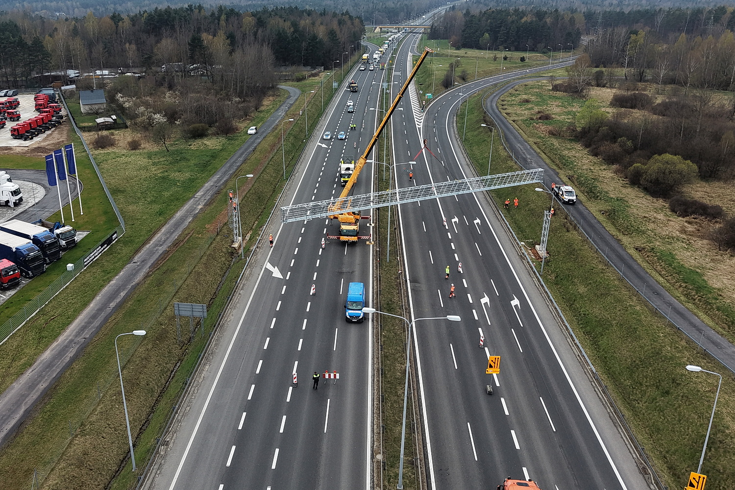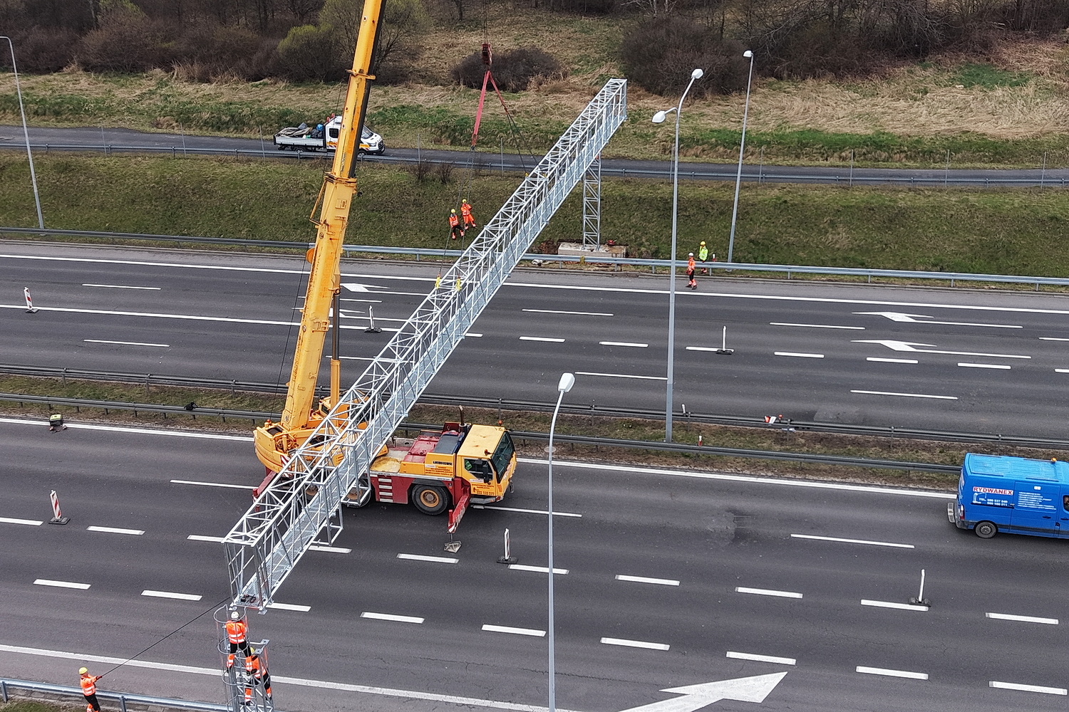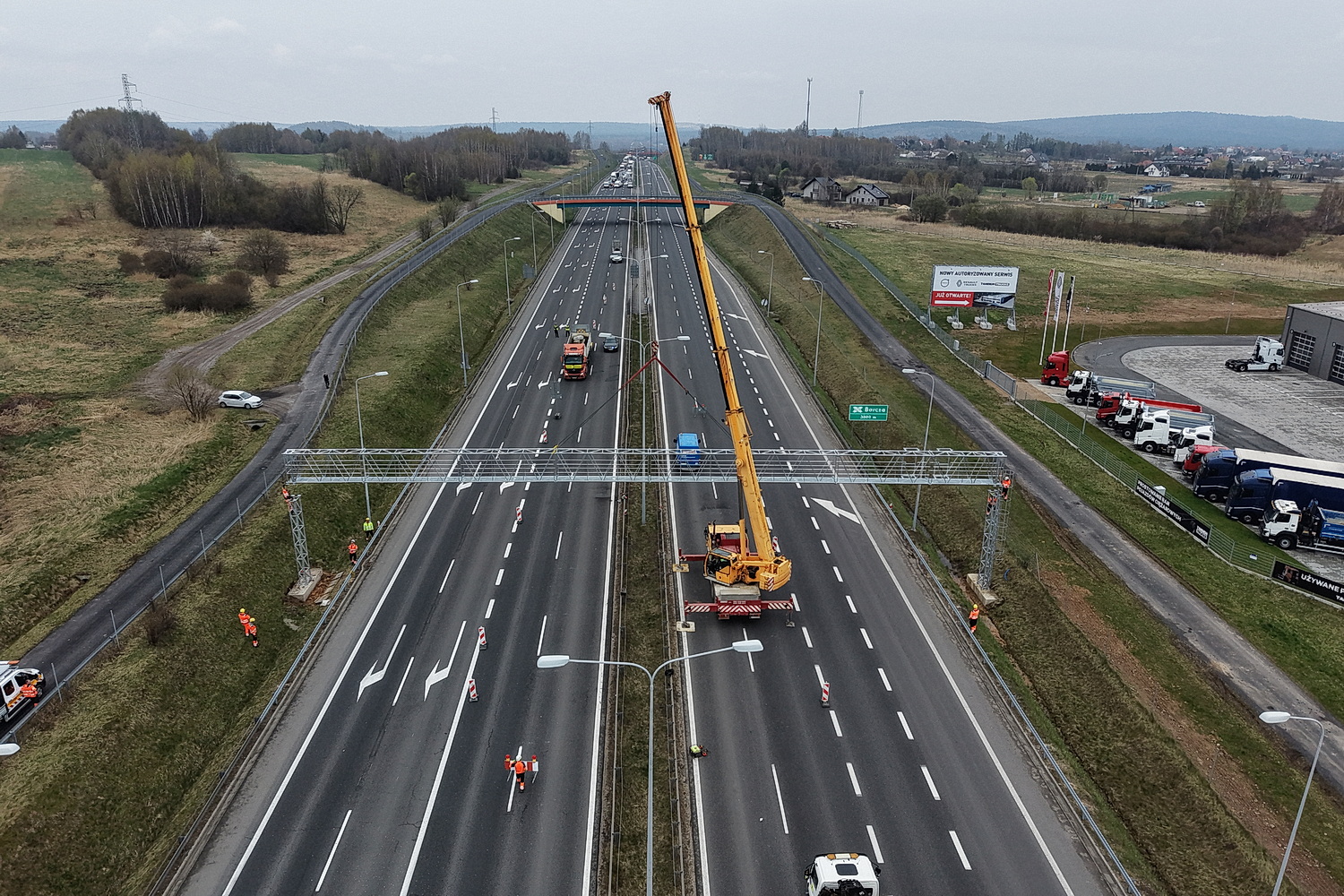 15.04.2026. Trasa ekspresowa S7, okolice węzła Kielce Północ. Montaż tzw. bramownic niezbędnych do uruchomienia odcinkowego pomiaru prędkości (OPP) / Fot. Jarosław Kubalski – Radio Kielce