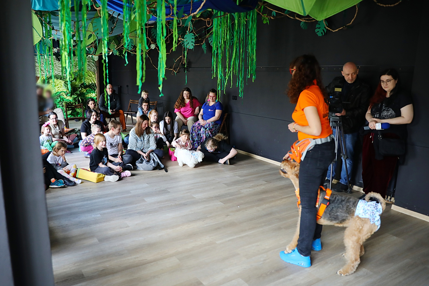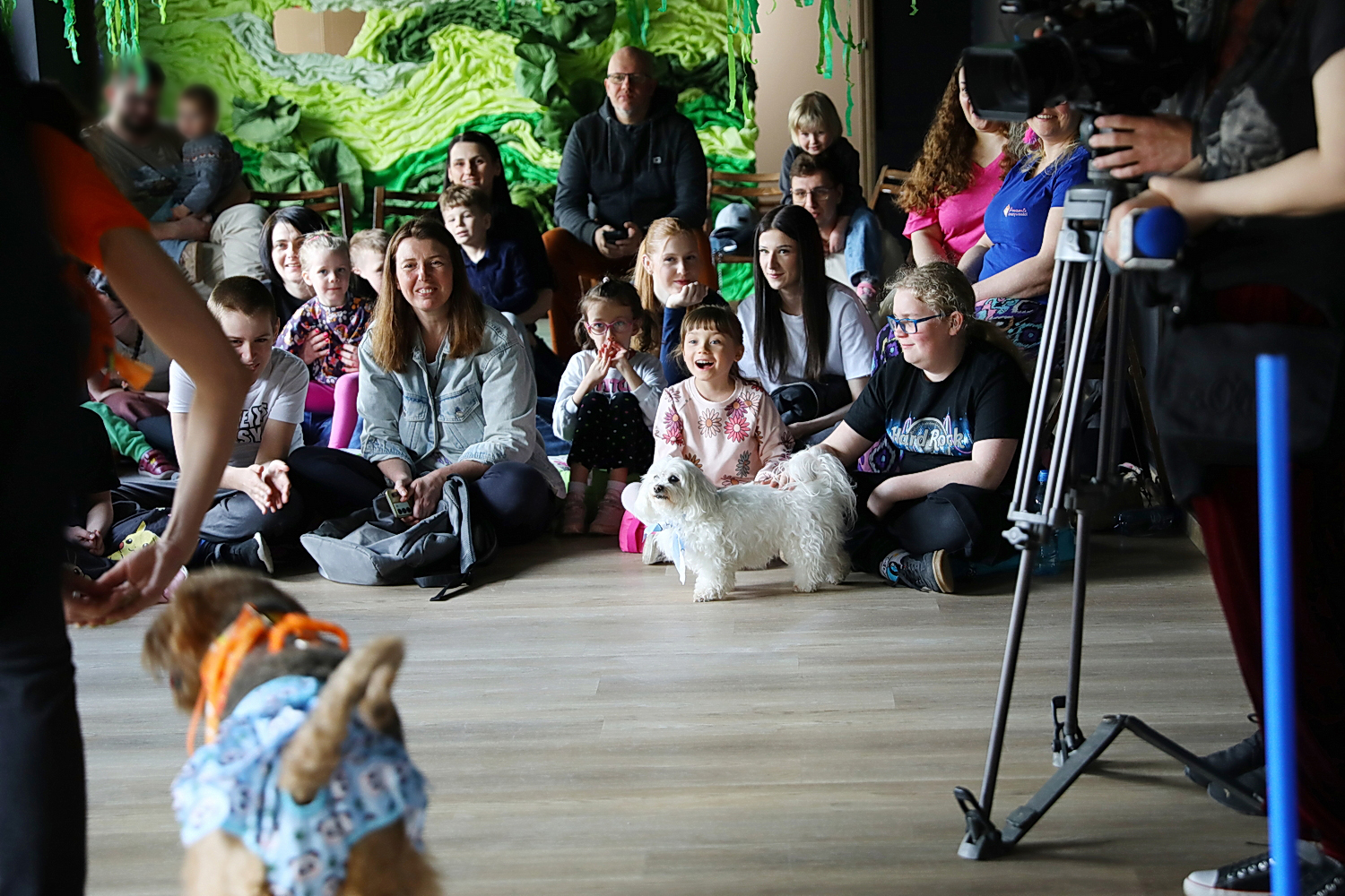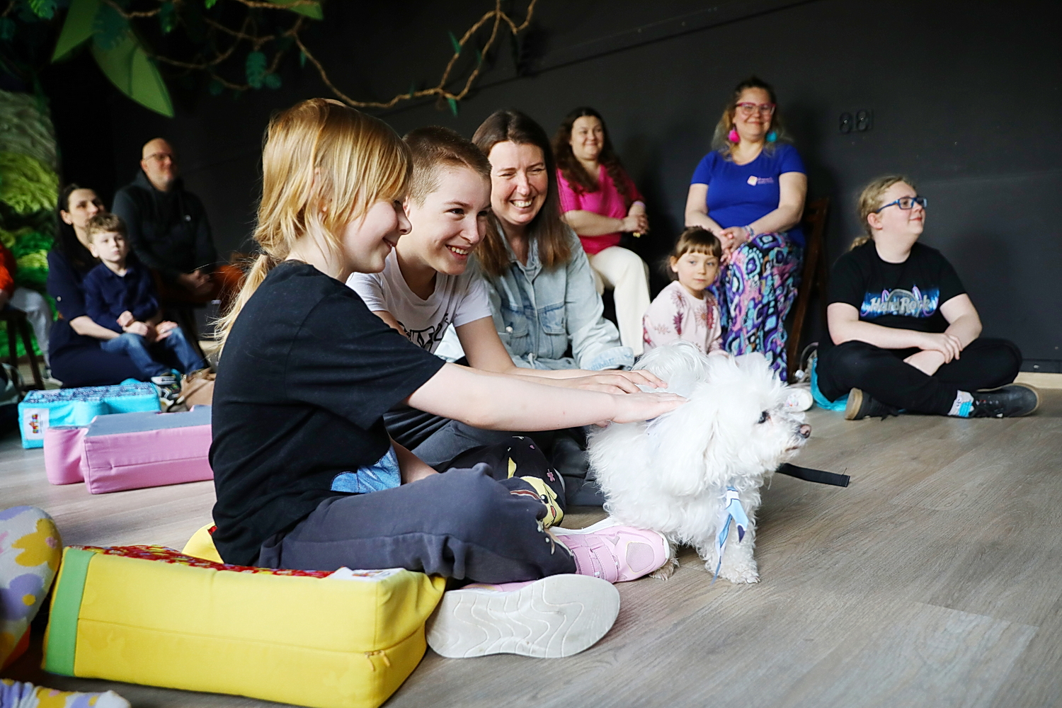 Program warsztatów obejmował m.in. zabawy z czworonogami, ćwiczenia wspierające rozwój emocjonalny oraz naukę budowania relacji poprzez kontakt ze zwierzętami.
