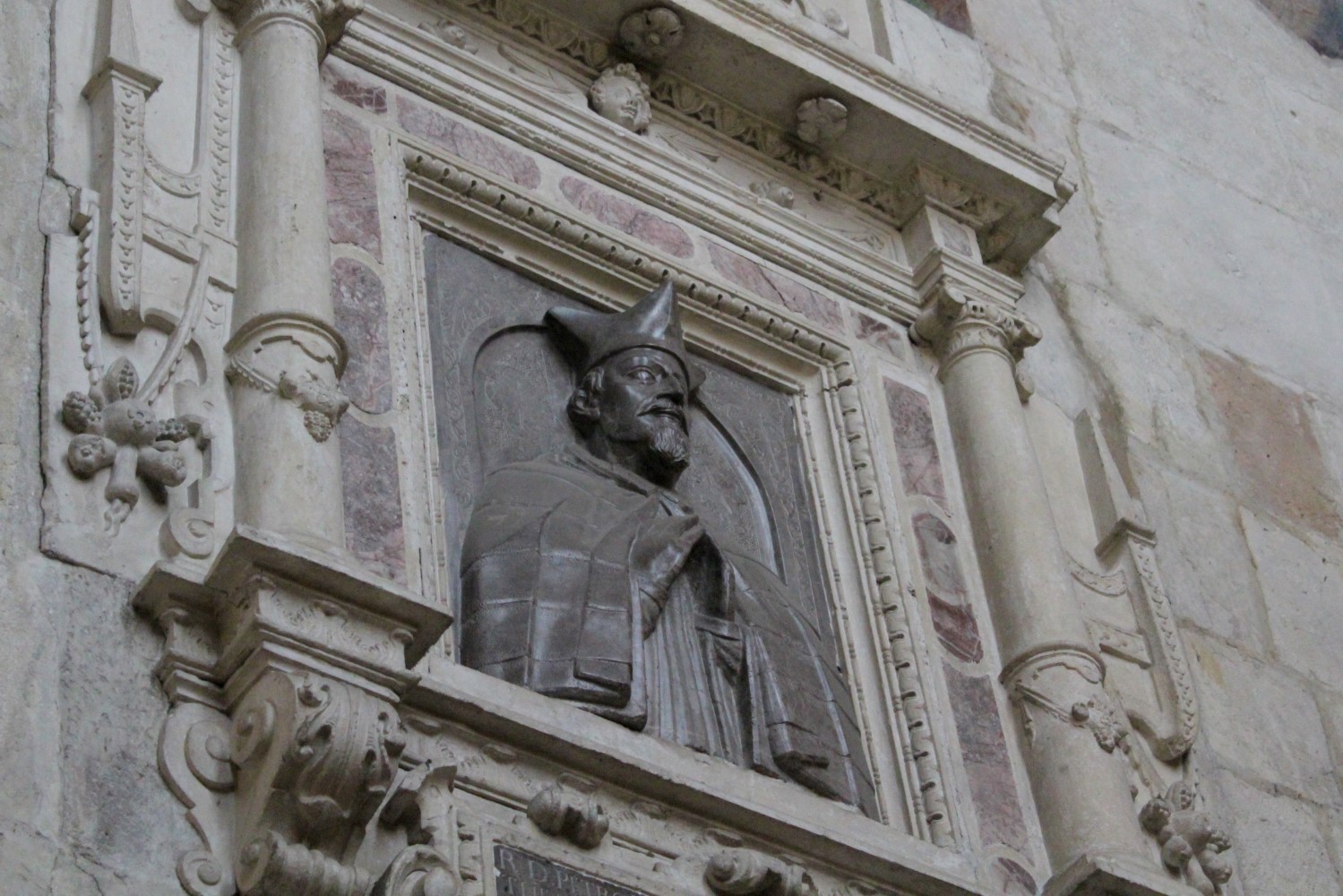 Rzeźba wykonana z marmuru w odcieniach brązu i czerwieni oraz z piaskowca jest bogato zdobiona.