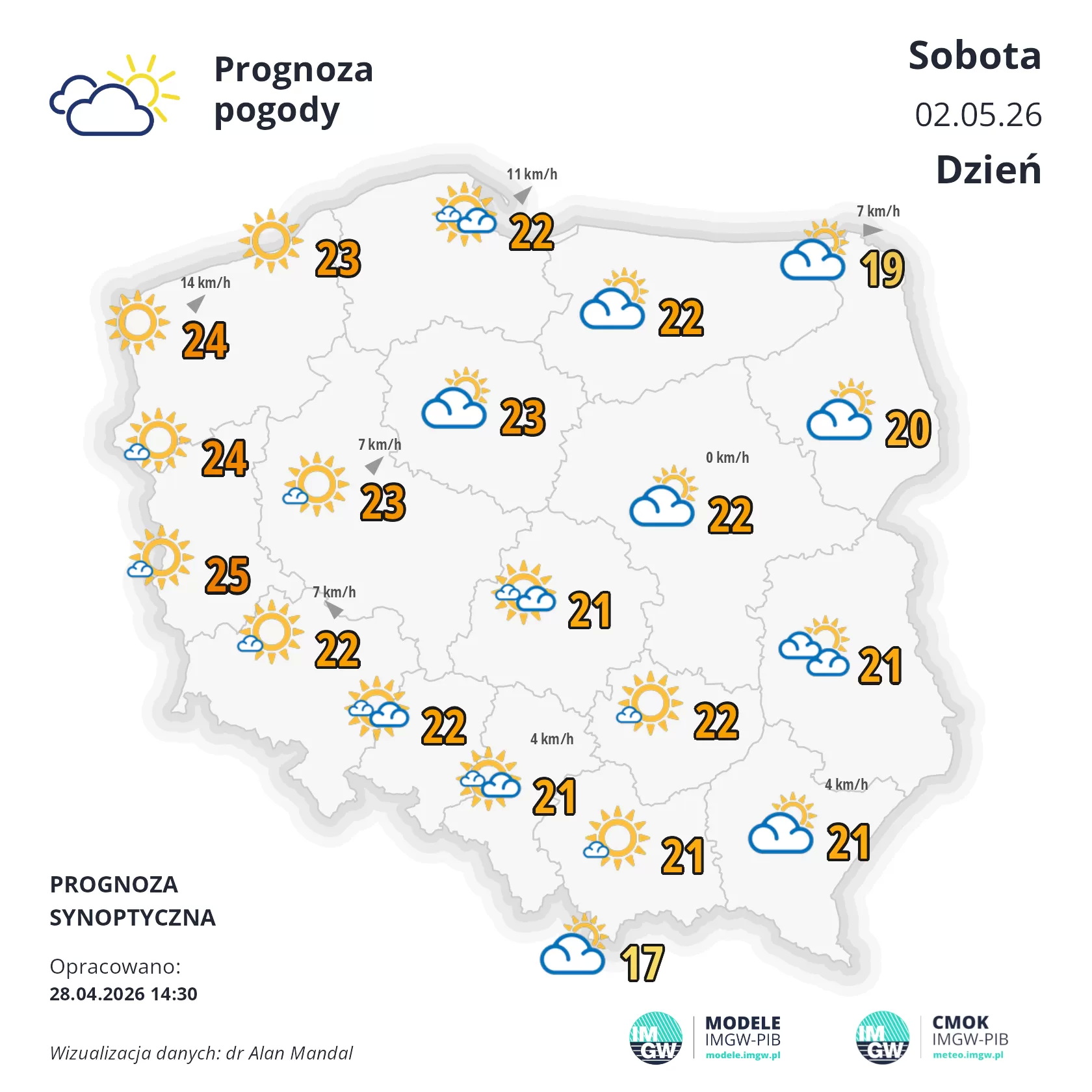 Sobota (2 maja) może być jeszcze cieplejsza i bardziej słoneczna. Nieco więcej chmur tylko na południowym wschodzie i tam może padać przelotny deszcz. Tam też będzie najchłodniej, temperatura maksymalna od 11°C do 16°C. Na pozostałym obszarze w najcieplejszym momencie dnia od 18°C na wschodzie, około 20°C w centrum, do 22°C na zachodzie. Wiatr będzie na ogół słaby, tylko na południowym wschodzie umiarkowany i porywisty, na zachodzie z kierunków południowych, na pozostałym obszarze z kierunków północnych.