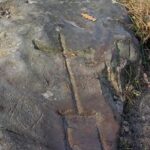 Idąc do celu naszej wyprawy, tylko wprawne oko zauważy pierwszy znak. Znaleźć go można na skale leżącej prawie na samej drodze w okolicach „Piekła Dalejowskiego”. Łatwo go jednak przegapić, bowiem jeżdżący tamtędy sprzęt do transportu drzew oraz błoto po deszczach czy roztopach mogą go skutecznie ukryć.