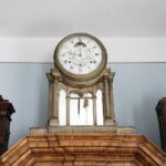 Zegar Antoniego Chęcińskiego wykonany w 1797 roku we Wrocławiu (w środku). Na tarczy – oprócz godzin i minut – pokazuje dzień miesiąca, dzień tygodnia, fazy księżyca, znaki zodiaku / Fot. Jarosław Kubalski – Radio Kielce