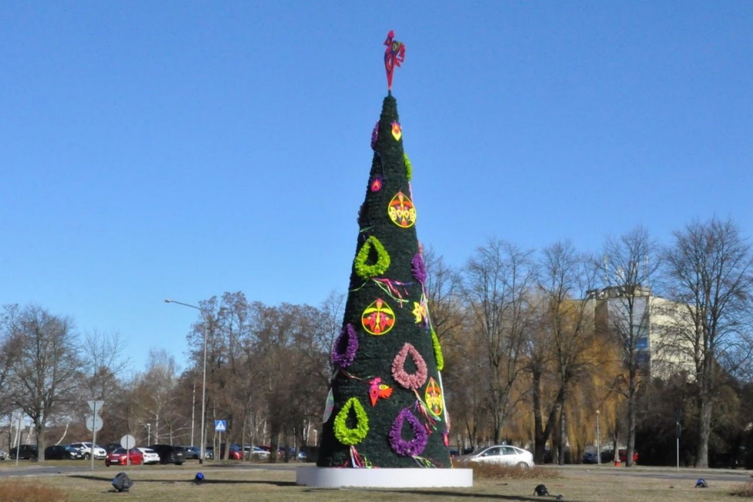 Przez ostatnie lata była to bożonarodzeniowa choinka, ale od minionego weekendu wiszą na niej wielkanocne ozdoby. Urzędnicy i pomysłodawcy określają ją „świątecznym drzewkiem”. Jest prezentem od lokalnej firmy, która zajmuje się produkcją ozdób świątecznych.