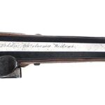 Broń posiada oryginalną jak na swoje czasy konstrukcję: zamek skałkowy zaopatrzony jest w specjalną rolkę współpracującą z pokrywą panewki, łańcuszek sprężyny głównej oraz osłonę przeciwdeszczową. Lufa jest gwintowana na całej długości precyzyjnym gwintem włoskowym, typowym dla pistoletów pojedynkowych. Mimo, że kurek jest dorobiony, to jego cechy charakterystyczne wskazują na wykonanie w jednej z przodujących pracowni rusznikarskich początku XIX wieku. Łoże, nieco gorszej jakości niż zamek, posiada nietypowy kształt: ostro zagięty chwyt był spotykany w pojedynkowej broni angielskiej i to wytwarzanej stosunkowo krótko, pomiędzy 1815 a 1825 rokiem. Co ciekawe, łoża tego rodzaju były znacznie krótsze od opisywanego. Dane pistoletu: kaliber 15 mm, długość 34,2 cm, waga 830 g, długość lufy 20,5 cm.