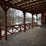 Obecnie zrobiono taras z kostki brukowej, powstała drewniana balustrada, umocniono przyległą skarpę ażurami betonowymi i ułożono kostkę brukową na miejscu parkingowym.
