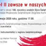 W internetowym wydarzeniu pod nazwą „Jan Paweł II zawsze w naszych sercach” wystąpią w nim wokaliści i instrumentaliści z województwa. Gościem specjalnym będzie biskup Marian Florczyk, a koncert poprowadzi dziennikarka Radia Kielce Magdalena Sitek.