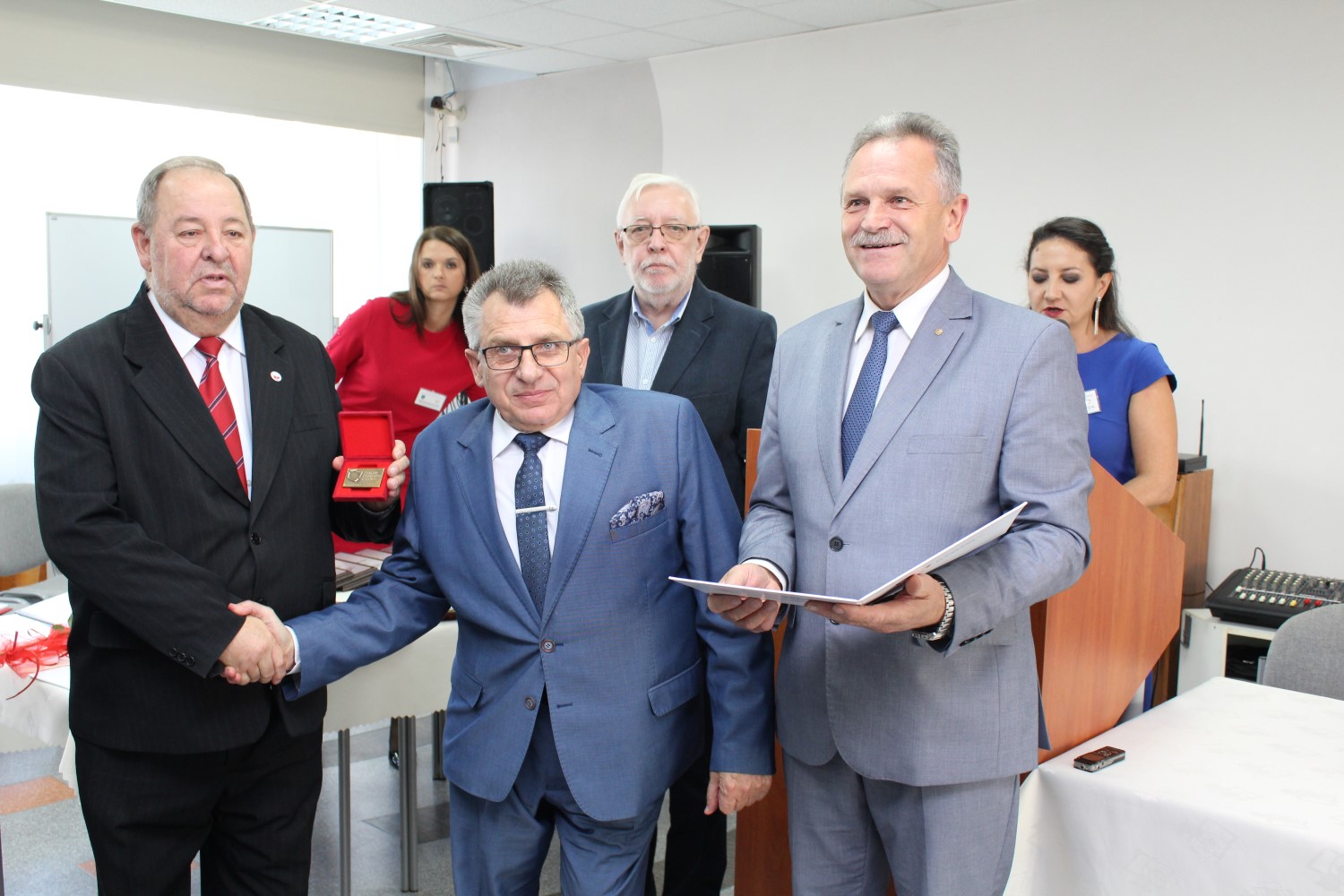 18.10.2019. Busko-Zdrój. Konwent Powiatów Województwa Świętokrzyskiego z okazji 20-lecia Samorządów Powiatowych. Na zdjęciu (od lewej): Jerzy Kolarz – starosta buski, Ludwik Węgrzyn – ekspert Związku Powiatów Polskich, Jan Nowak – starosta kazimierski, Jerzy Stępień – były prezes Trybunału Konstytucyjnego, Edmund Kaczmarek – były starosta jędrzejowski, Stanisław Masternak – były starosta sandomierski / Marta Gajda / Radio Kielce