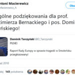 Ze szczególnymi podziękowaniami do posła Dominika Tarczyńskiego i profesora Włodzimierza Bernackiego zwrócił się w serwisie Twitter Antoni Macierewicz.