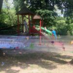 Używano m. in. folii bąbelkowej, farb, kredy oraz gąbek do zmywania naczyń, które służyły do odbijania na kartonie prostokątnego kształtu. Pomiędzy dużymi drzewami rozciągnięto szeroką folię, na której każdy mógł coś narysować. Animatorka zajęć organizowała różne zabawy, np. pojedynek na szable, którymi były cienkie balony. Niedzielny wieczór w parku zakończył się turniejem gier planszowych.