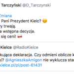Sam poseł Dominik Tarczyński odniósł się do informacji o możliwości startu Agnieszki Migoń na Twitterze. „Przyszła pani prezydent Kielc? Rozmowy trwają. Odważna wstępna decyzja. Odwaga się ceni!” – napisał.