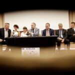Kielce. Konferencja prasowa z udziałem członków Komisji Ewaluacyjnej ACES Europe. Bogdan Wenta, Andrea Palanska, tłumaczka, Hugo Alonso, prezydent miasta Wojciech Lubawski, Wiesław Wilczyński i Lukas Vorel-Adams. fot. Jarosław Kubalski