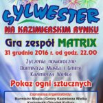 Mieszkańcy Kazimierzy Wielkiej mogą przywitać Nowy Rok na Rynku. W programie Występ zespołu Matrix, życzenia noworoczne burmistrza miasta i gminy, a także pokaz sztucznych ogni. Impreza zaczyna się o 22.00.