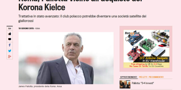 Amerykański biznesmen- James Pallotta, który jest właścicielem AS Roma, widzi możliwość zrobienia z borykającej się z kłopotami finansowymi Korony, satelickiego zespołu dla wicemistrza Włoch. W Kielcach mogliby wówczas grać na zasadzie wypożyczenia piłkarze, którzy nie mieszczą się w szerokiej kadrze włoskiego klubu. „La Gazzetta dello Sport” informuje również, że w Kielcach gościł ostatnio dyrektor sportowy Romy- Guido Sabatini.