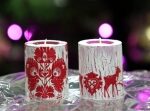 Drewniany zestaw świeczników ze świecami. Wysokość około 10 cm, średnica około 4 cm. Podarowany przez  Stowarzyszenia Siemacha.