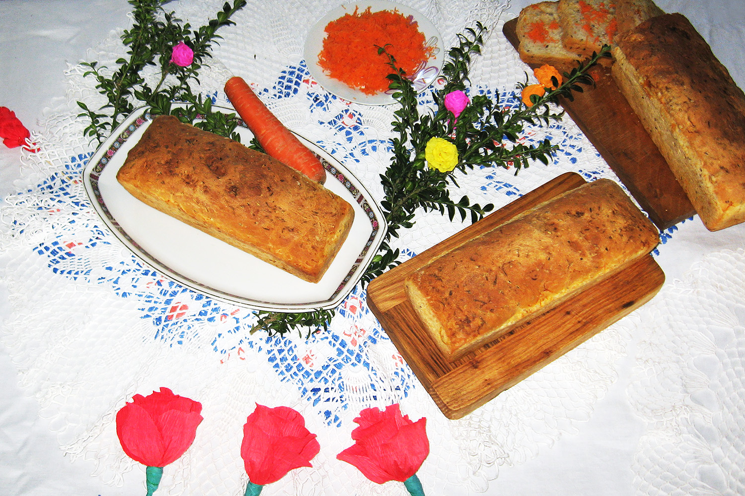 Dzień wcześniej przygotować zaczyn: wymieszać zakwas chlebowy z mlekiem, mąką żytnią i zostawić do wyrośnięcia na całą noc. Do zaczynu dodać mleko, mąkę pszenną i sól. Wyrobić ciasto w dzieży, aż ręka będzie od niego odchodziła. Im dłużej ciasto będzie wyrabiane, tym lepszy będzie chleb. Po wyrośnięciu dodać utartą marchewkę, wymieszać i znowu pozostawić do wyrośnięcia. Uformować chleb, ułożyć na liściach chrzanu lub kapusty