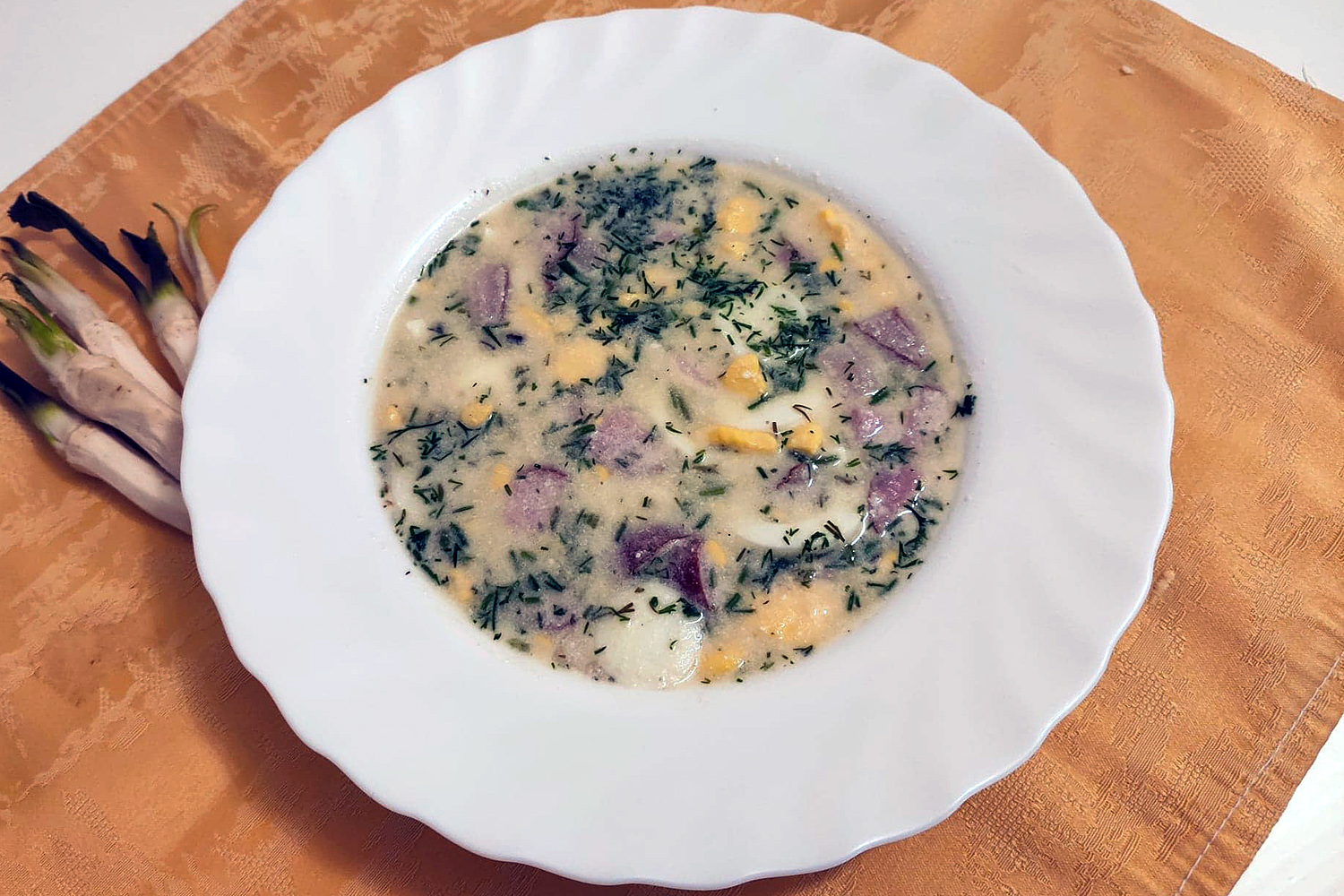 SPOSÓB PRZYGOTOWANIA: Maślankę z boczkiem, pokrojoną w plastry kiełbasą oraz z startym na tarce chrzanem gotować przez 45 minut. Dodać pokrojone w plastry ugotowane jajka i gotować jeszcze przez 15 minut. Doprawić pieprzem, solą i dodać śmietanę. Posypać koperkiem.