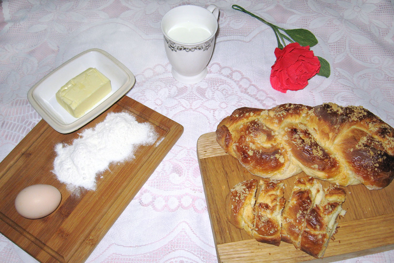 Drożdże utrzeć z łyżką cukru, łyżką mąki i 5 łyżkami ciepłego mleka. Pozostawić do wyrośnięcia. Resztę mąki przesiać do miski, zrobić w środku dołek, dodać utarte z cukrem żółtka, wyrośnięty rozczyn drożdżowy i ciepłe mleko. Wyrabiać ciasto tak długo, aż będzie odstawało od ręki, dopiero wtedy dodać roztopione masło i dalej wyrabiać. Ciasto nakryć ściereczką i zostawić w ciepłym miejscu do wyrośnięcia. Wyrośnięte ciasto podzielić na części, formować z nich wałeczki i uplatać z nich „warkocze”. Końce należy dobrze zlepić i całość zostawić do wyrośnięcia. Przed włożeniem do piekarnika należy posmarować „warkocze” ubitymi białkami i posypać kruszonką (trochę masła, cukru i mąki ucierać dłońmi, aby zrobiły się kuleczki). Piec w piekarniku nagrzanym do 180 ̊C ok. 30-35 minut. Można sprawdzać patyczkiem, czy są upieczone. Spożywać z mlekiem lub z kakao.