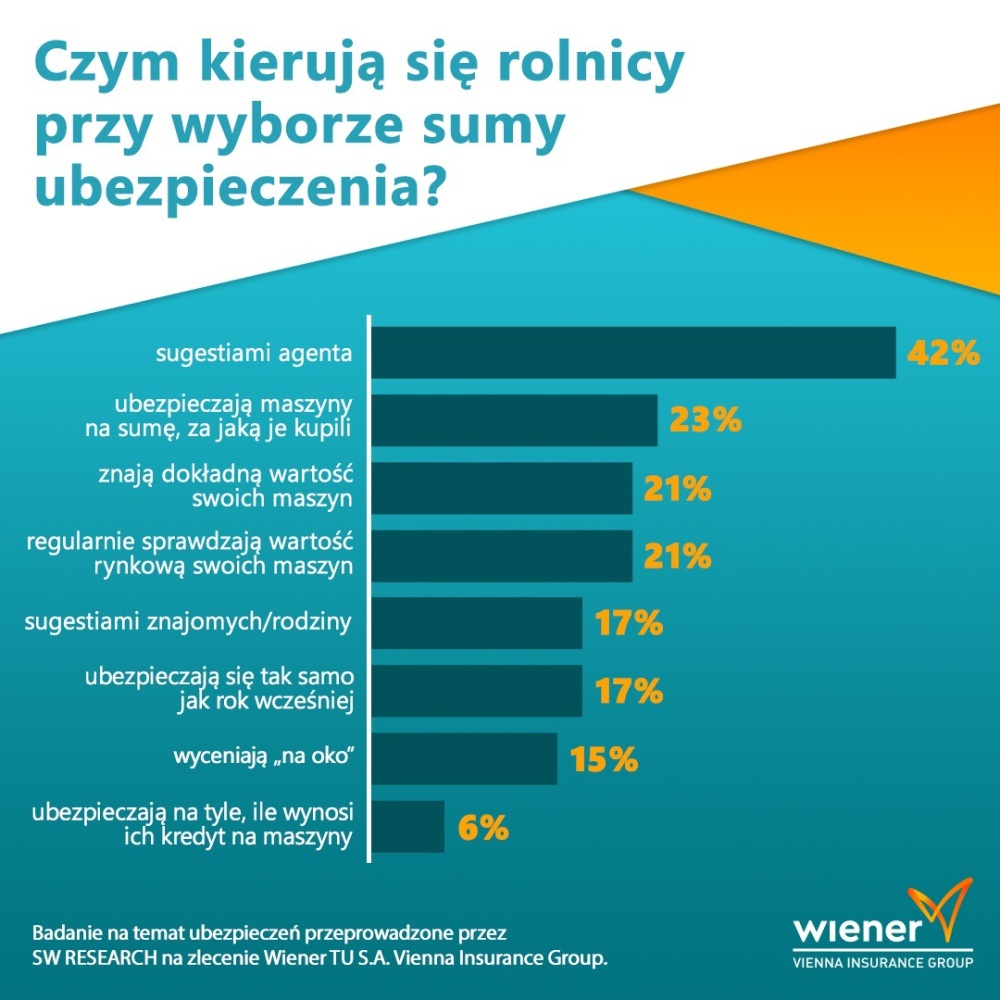 Firma Wiener zapytała również, czym kierują się rolnicy, wybierając sumy ubezpieczenia. W przypadku budynków gospodarczych, rolnicy najczęściej kierowali się sugestiami agenta (36 proc.). Co czwarty ubezpieczył je na taką samą wartość, jak rok wcześniej. Co piąty zna dokładną wartość swoich budynków gospodarczych, a taki sam odsetek wycenia wartość budynków „na oko”.