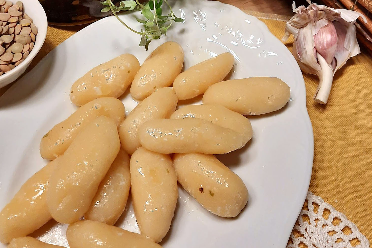 Ciepłą soczewicę włożyć do miski i tłuczkiem do ziemniaków rozdrobnić. Doprawić solą, czosnkiem i pieprzem do smaku. Uklepać i pozostawić do wystygnięcia. Następnie dodać mąkę ziemniaczaną i wyrobić całość ręcznie (jeżeli ciasto się klei, dodać odrobinę mąki ziemniaczanej). Ulepić zgrabne, nieduże kluseczki, lekko spłaszczyć i ugotować w dużej ilości osolonej wody. Kluski można podawać z sosem, pomidorami, jabłkiem